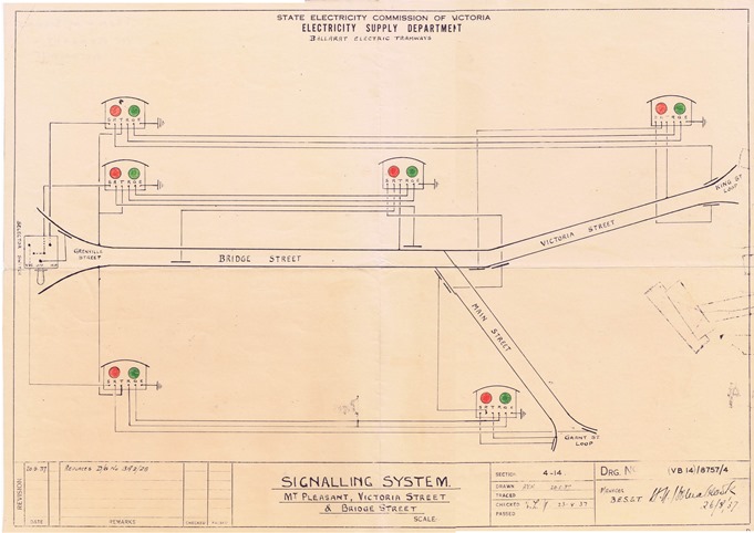 The SEC decided to install “Forest City” colour light signals on its three tramway systems at Ballarat, Bendigo and Geelong. It intended to relay the single track in Bridge Street in double track, but after opposition by the Royal Automobile Club of Victoria the Ballarat Council refused permission. The Bridge Street single track was relaid early in 1937, and that appears to have been the first section fitted with Forest City signals. Other lines followed over the next year.
