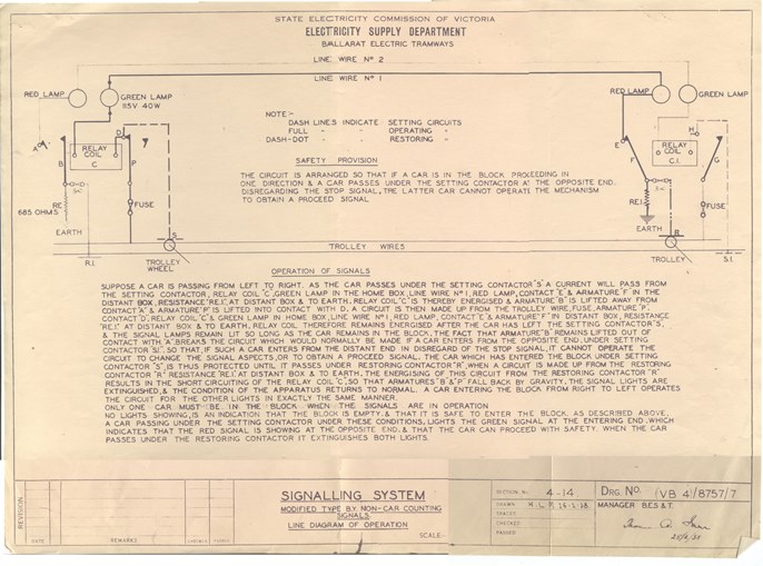 “These signals therefore vary from the Nachod signals inasmuch as shunting back under the contact, without going through the section, will not restore them to neutral. Where cars are tabled to a certain loop to turn, such as No. 2 loop Wembley, the trolley must be pulled down, and car allowed to coast under contact between 2 and 3 loops, both ways, when running around the loop”. [8]