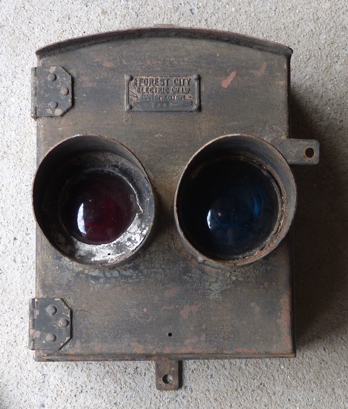 The Forest City signalling system was operated by the contact of trolley wheels with insulated contactors on the overhead wire. Red and green coloured signals were shown in a box mounted on a pole just past the loop.