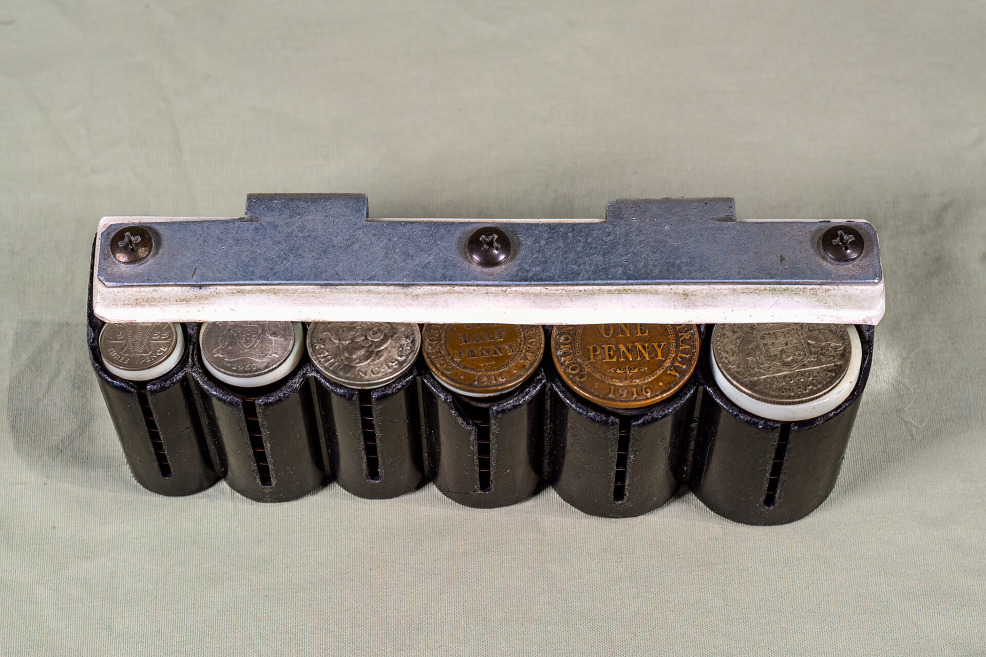 This spring loaded coin dispenser held coins in the conductor’s bags. They allowed the coins to be kept together by value to make giving change for fares much easier. This dispenser is holding coins from pre 1966. Decimal currency was introduced into Australia on 14 February 1966.