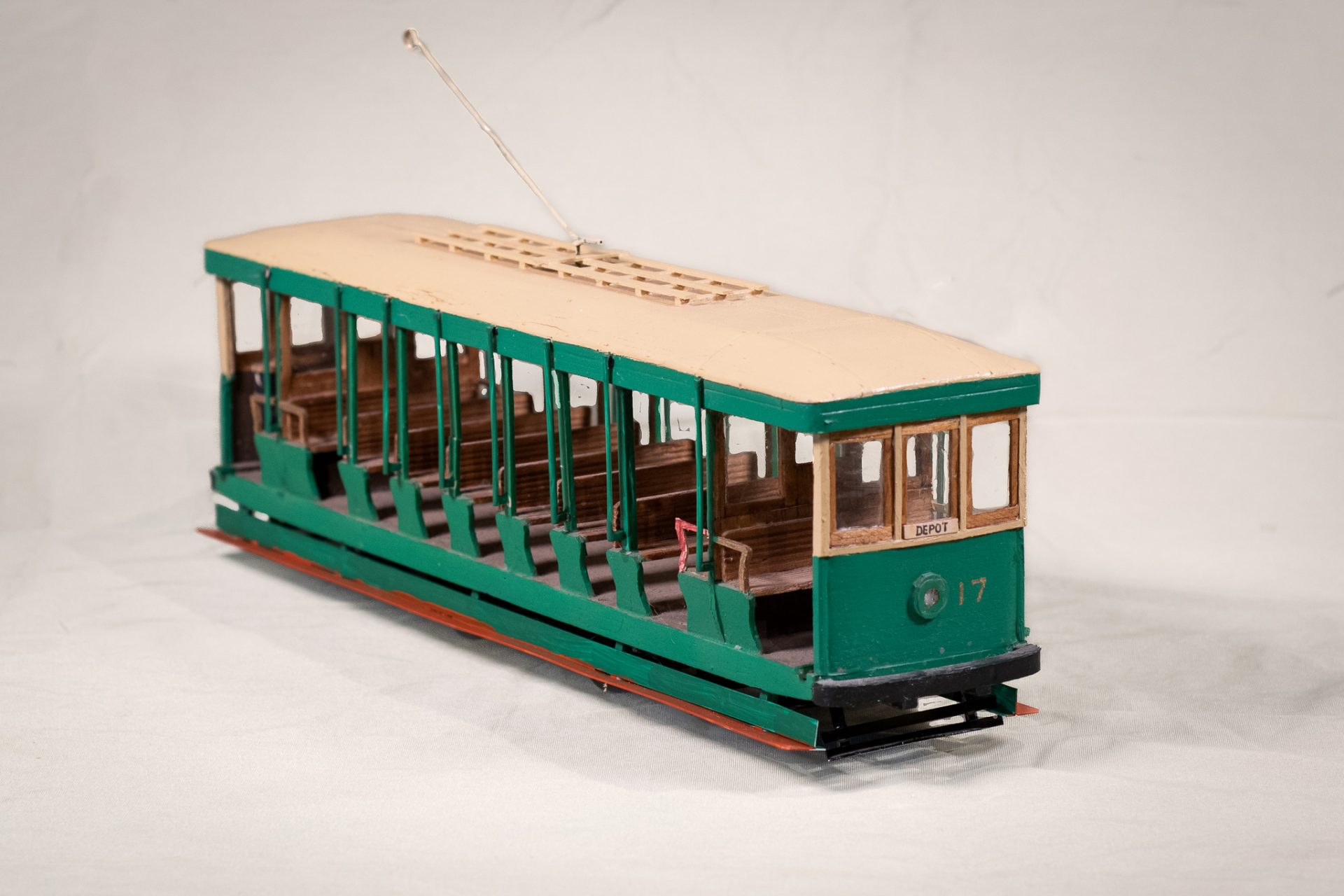 This hand made wooden model shows a cross bench tram car, known as a summer car. It was made for the Bendigo Tramway in the 1970s, possibly for sale in their shop. The maker is unknown. From the collection of Tim Borchers and repaired for our display by Chris Phillips.