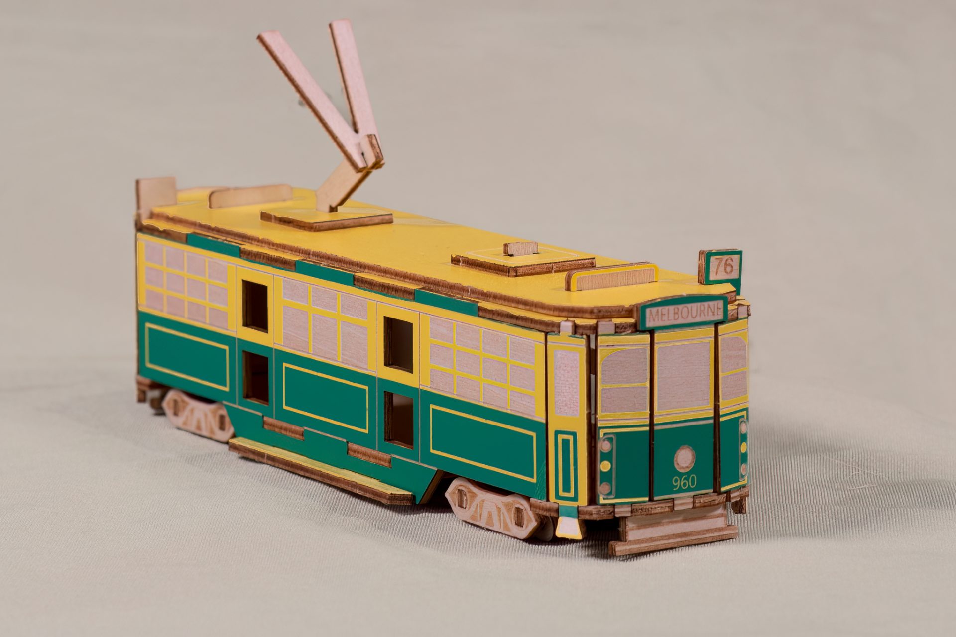 This is a commercially produced wooden model kit to make a Melbourne SW6 Class tram, No. 960. The parts are pre-painted and the kit slots together without glue or nails.