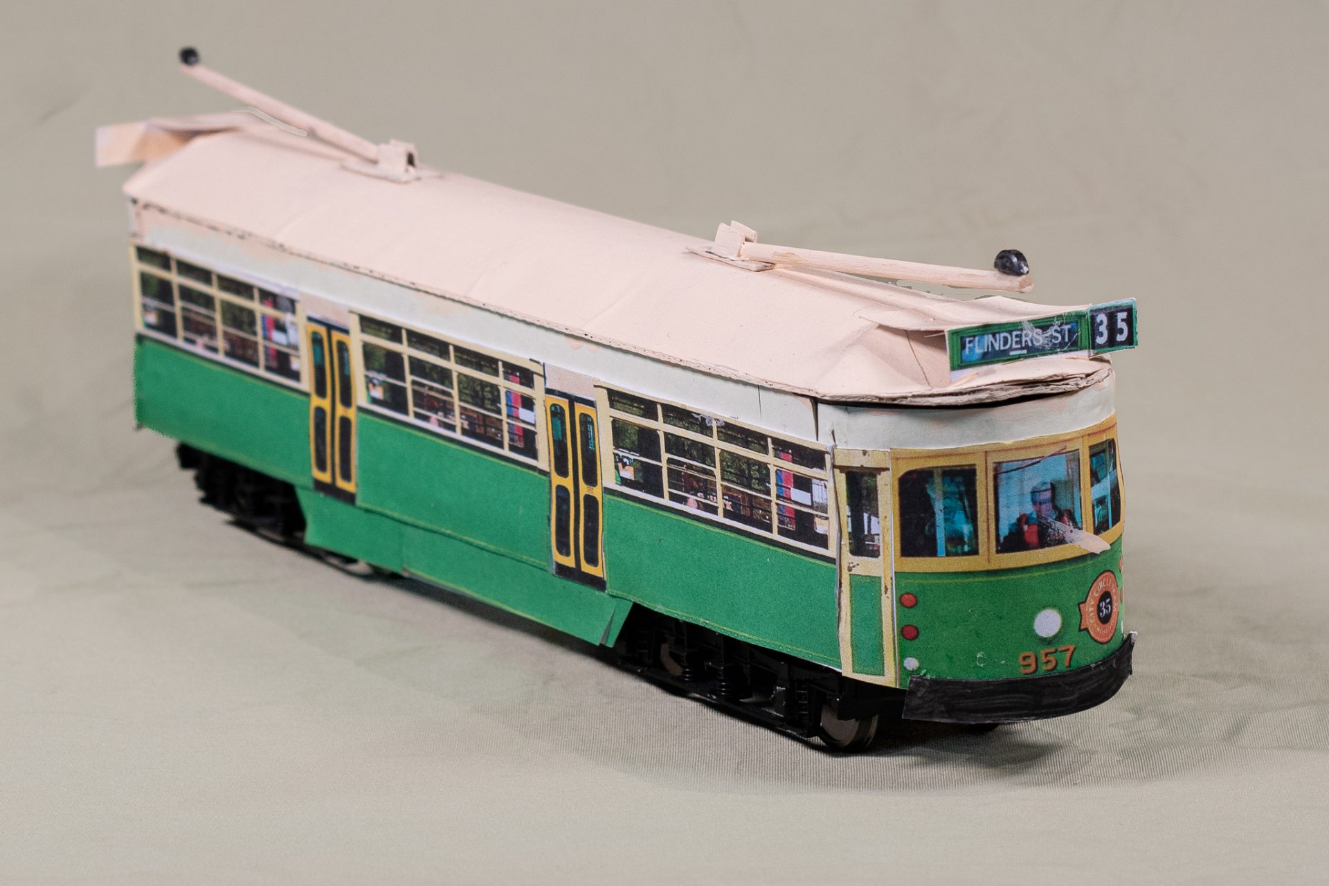 This model of Melbourne W Class tram, No. 957, is made from a block of wood and cardboard which has been covered with a colour photo of the tram. It is sitting on metal bogies. Made by David Hawksworth, 2021.