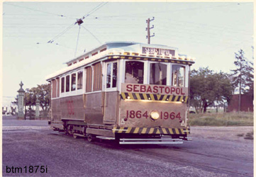 In 1964 this car was decorated for the centenary of the Borough of Sebastopol and donated to that borough in 1971 by the SEC. The tram returned to Ballarat in 1982 on loan to the Museum. This was the last car to move through the city area of Ballarat.